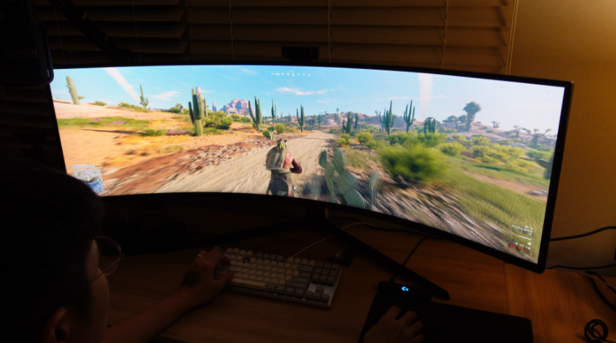다음은 오디세이G9 의 모습입니다. 한 눈에 다 들어오기 벅찰 정도로 큰 모습입니다만, 1000R 이라는 곡률 덕분에 생각보다 볼만한 각이 나오는 것 같습니다. 이전 모델에 비해 곡률이 개선 된 만큼 가독성도 좋아진 것 같습니다. 다만, 32:9 비율인 만큼, 일반적인 동영상 재생의 경우 아래처럼 좌우로 조금 늘어지게 보이게 됩니다.