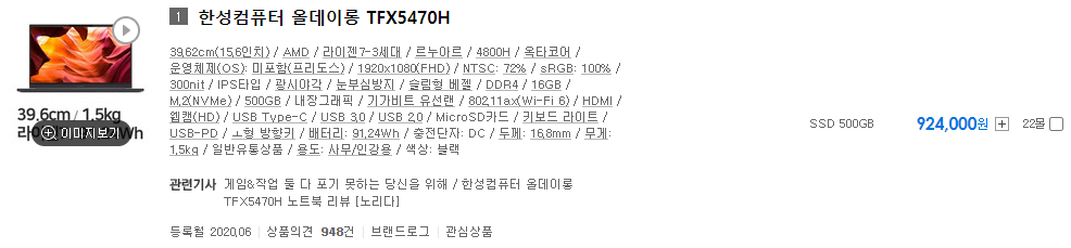 첫번째는 바로 한성컴퓨터의 올데이롱 TFX5470H 입니다. 이 제품을 선택한 이유는 100만원 이하의 가격대에서 AMD Ryzen7 4800H 제품을 사용할 수 있다는 점과 1.5kg 의 무난한 무게, 그리고 나쁘지 않은 한성 컴퓨터의 A/S 망 때문입니다. (삼성, 엘지와 비교하면 당연히 안되겠지만, MSI 나 기타 브랜드에 비해 A/S 가 좋습니다) 또한, 외부에서 작업을 할 경우 배터리 사용시간이 중요한데, 이 제품은 91.24Wh 라는 대용량의 배터리를 탑재 하고 있어 동영상 감상시 8시간 이상 사용할 수 있다는 장점이 있습니다. 다만, 투박하지만 깔끔한 디자인에 대해서는 호불호가 갈릴 수 있을 것 같습니다.